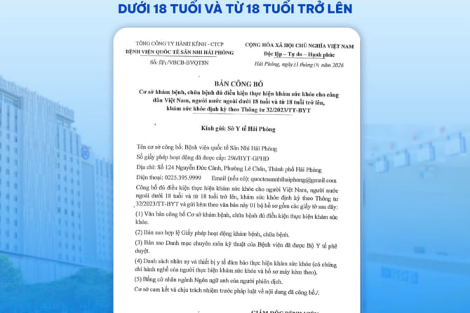 Bệnh viện Quốc tế Sản Nhi Hải Phòng trân trọng thông báo: Bệnh viện chính thức triển khai hoạt động khám sức khỏe cho công dân Việt Nam và người nước ngoài, bao gồm người dưới 18 tuổi và người từ 18 tuổi trở lên, theo quy định tại Thông tư số 32/2023/TT-BYT của Bộ Y tế.